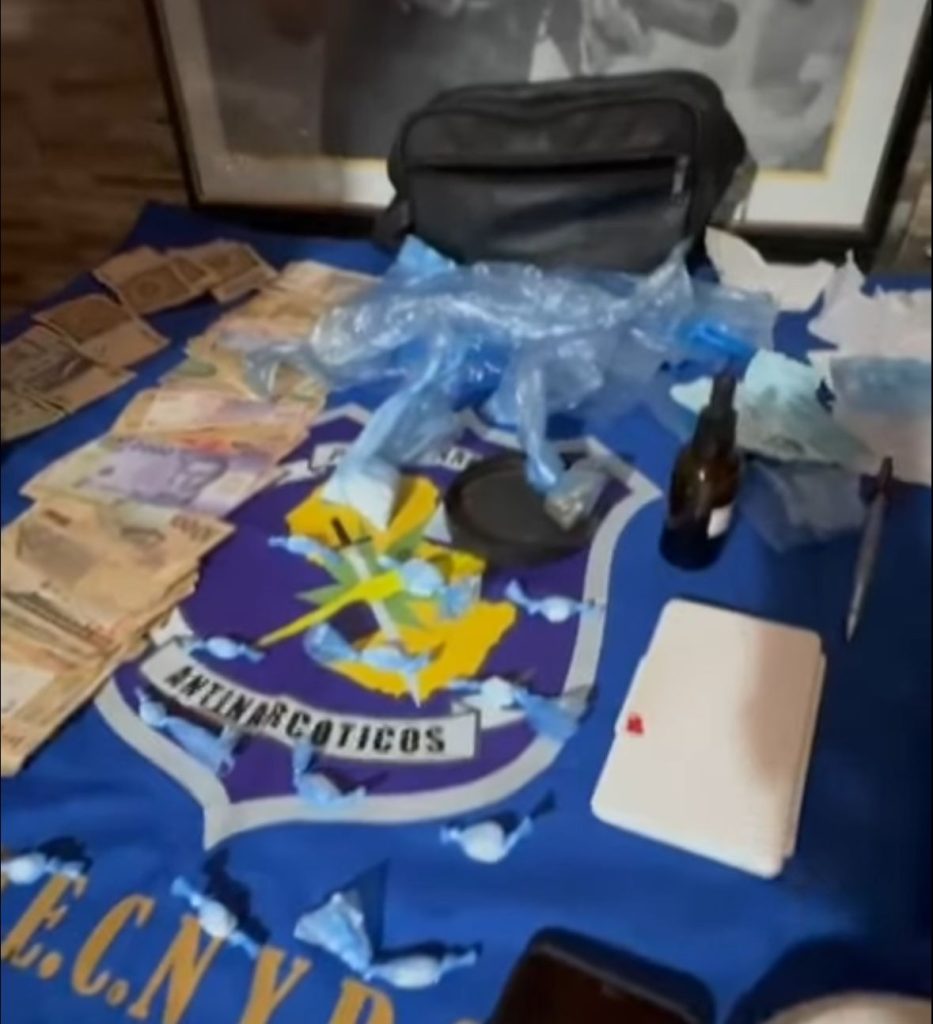 En el sitio, los intervinientes incautaron 24,8 gramos de supuesta cocaína en una bolsa de polietileno azul, 9,3 gramos de la misma sustancia distribuidos en 15 dosis, 2,5 gramos de supuesta marihuana, un teléfono celular iPhone X5, dos balanzas de precisión, documentos varios y la suma de 750.000 guaraníes en efectivo.