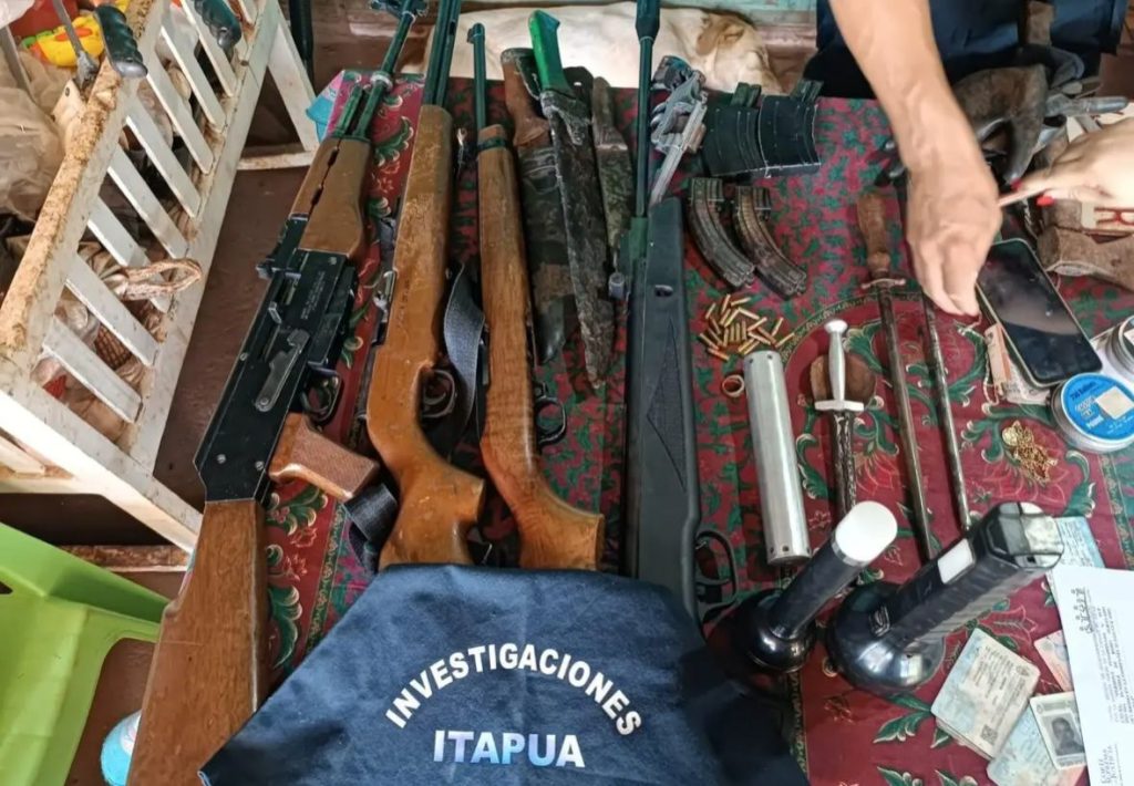 El primer allanamiento se efectuó en una vivienda propiedad de Eugenio Arévalos Sosa, donde el mismo fue intervenido y se procedió a la incautación de diversas evidencias, entre ellas armas de fuego largas y cortas, armas blancas, aparatos celulares y varias herramientas.