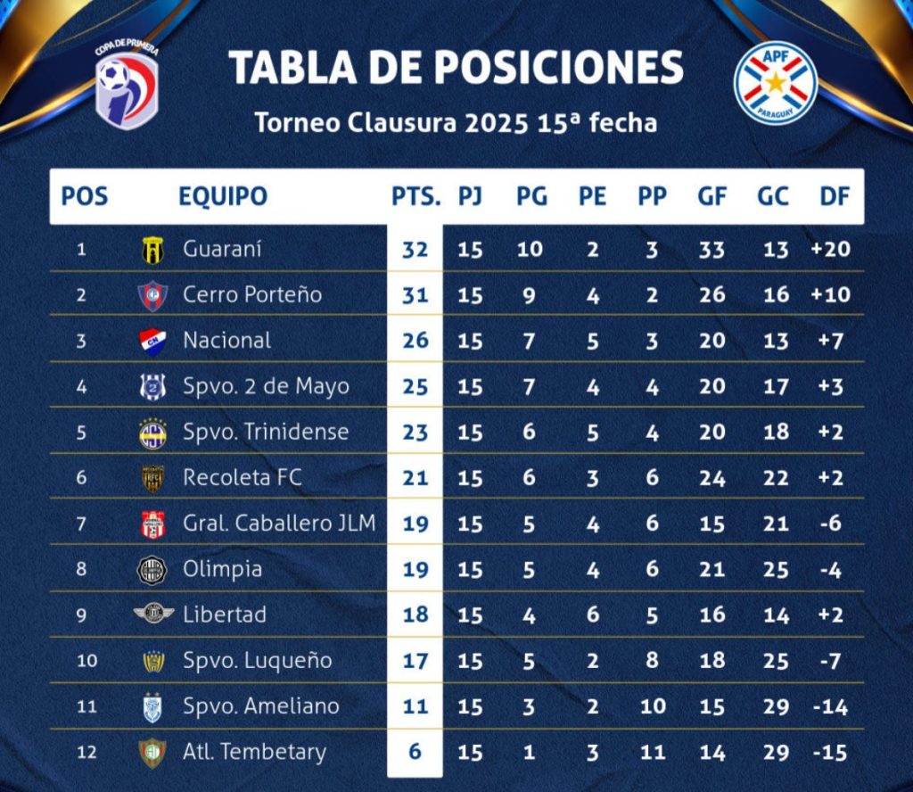 La fecha 15 del Torneo Clausura 2025 llegó a su fin este último lunes, consolidando a Guaraní en la cima de la tabla con 32 puntos. El equipo aurinegro logró mantenerse como líder gracias a su victoria 1-0 frente a Atlético Tembetary, mientras que Cerro Porteño sigue de cerca peligrosamente con 31 unidades tras vencer 2-0 a Recoleta FC.