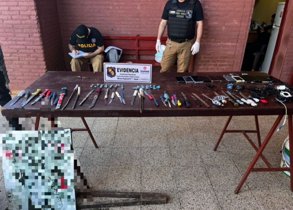 El procedimiento, ejecutado conforme a la Nota de Servicio Nº 3.149/2025, permitió la detección y retiro de 27,7 gramos de supuesta marihuana, fraccionada en bolsitas de polietileno; 12 teléfonos celulares de distintas marcas; 37 armas blancas de fabricación casera, entre ellas estoques, puñales y cuchillos; además de 14 cargadores, siete baldes y diez botellas con bebidas fermentadas tipo chicha, una balanza de precisión y cuatro paquetes de levadura de 500 gramos, presumiblemente utilizados para la producción de alcohol artesanal.