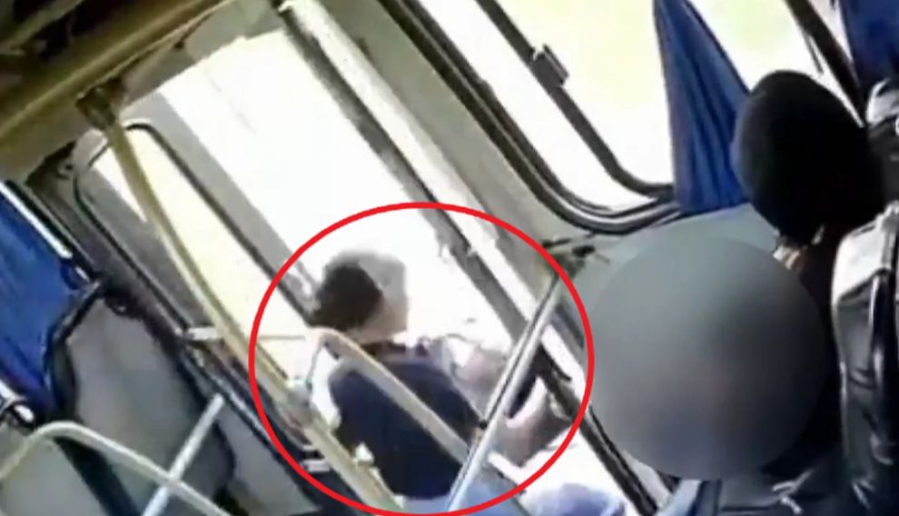 Se puede observar a la joven, que se disponía a bajar del ómnibus, siendo testigo del acto exhibicionista. Cuando el chofer del bus abre la puerta trasera, la joven se lanza, sin esperar que el rodado frene totalmente.